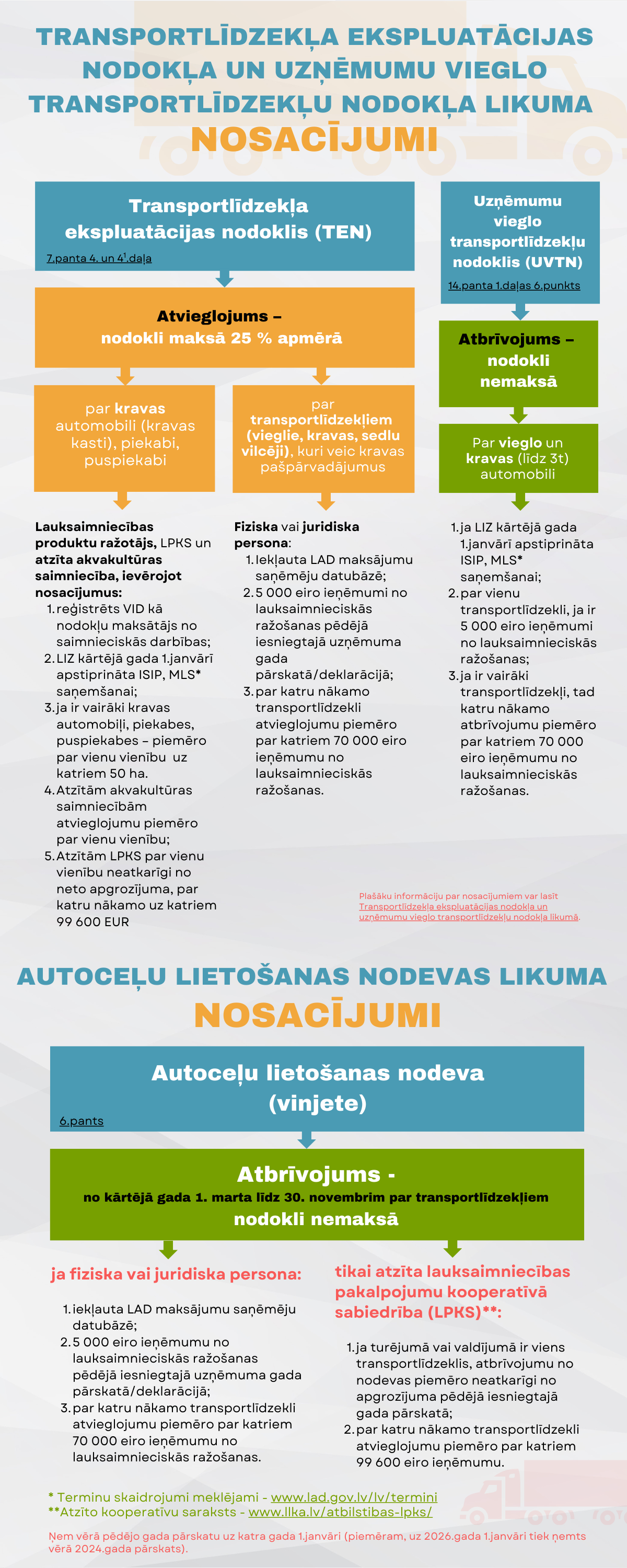 Infografikā apkopota informācija par transportlīdzekļu ekspluatācijas nodokļa un autoceļu lietošanas atvieglojumiem un atbrīvojumiem.