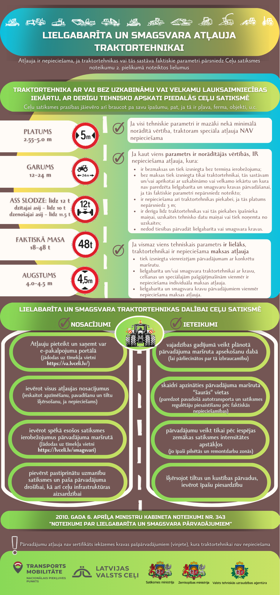 Atļauja ir nepieciešama traktortehnikai vai tās sastāvam, ar vai bez uzkabināmu vai velkamu lauksaimniecības iekārtu, ar derīgu tehnisko apskati, kas piedalās ceļu satiksmē, ja tās faktiskie parametri pārsniedz Ceļu satiksmes noteikumu 2. pielikumā noteiktos minimālos lielumus - platums, garums, augstums, faktiskā masa vai ass slodze.